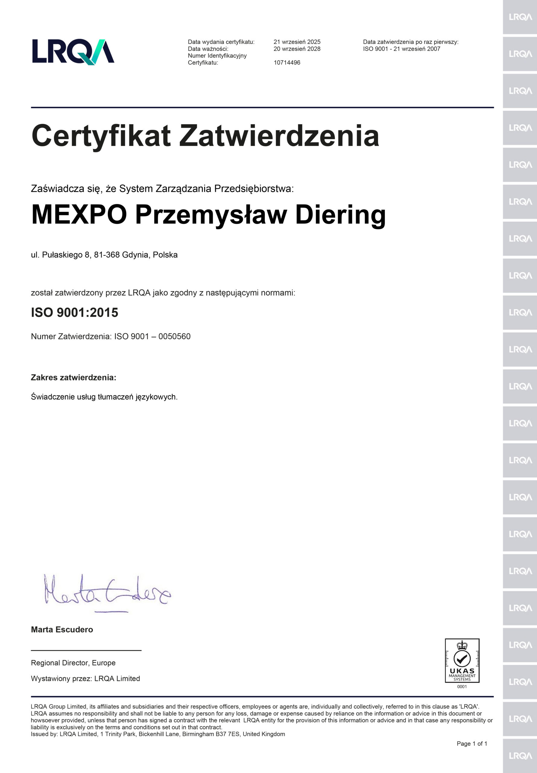Posiadamy Certyfikat zatwierdzający nasz system zarządzania jakością jako zgodny z ww. normą w zakresie usług tłumaczeń.