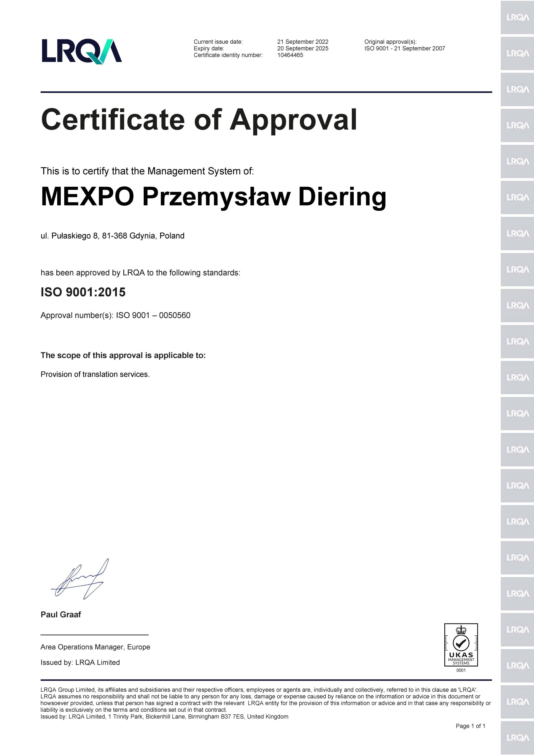 У нас есть сертификат, подтверждающий, что наша система управления качеством соответствует вышеупомянутому стандарту в сфере переводческих услуг.